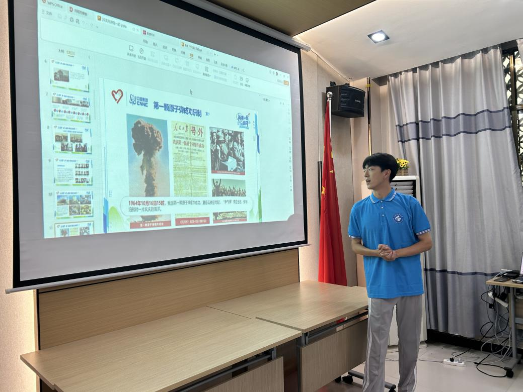 圖為團隊成員趙品皓正在匯報“兩彈一星”元勛留學(xué)報國精神