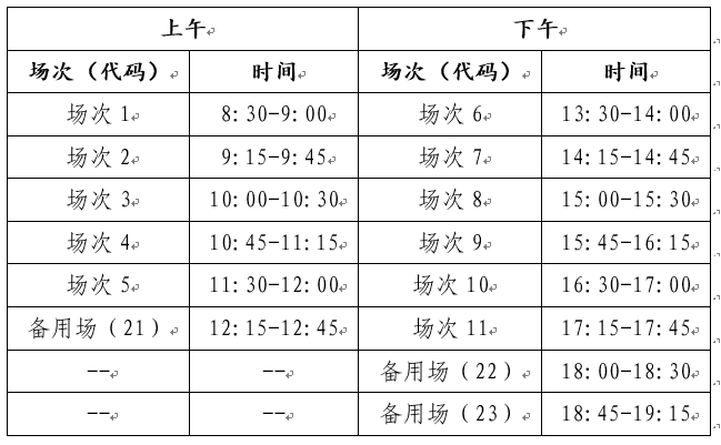 英語(yǔ)四級(jí)口語(yǔ)考試(CET-SET4)考試時(shí)間為11月23日,英語(yǔ)六級(jí)口語(yǔ)考試(CET-SET6)考試時(shí)間為11月24日,具體場(chǎng)次安排如下: