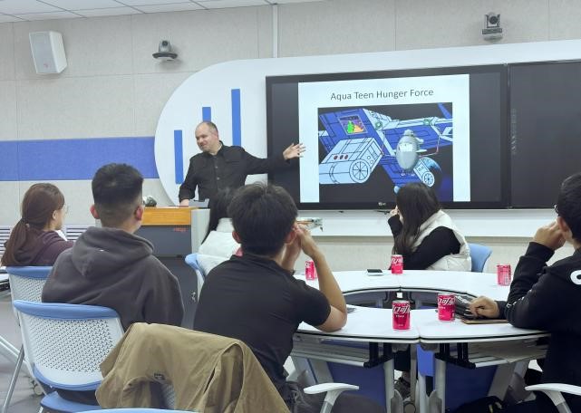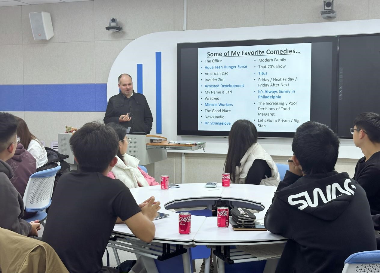 2024年10月29日,第五期英語(yǔ)角活動(dòng)再次拉開(kāi)帷幕,由外教Matthew主講,以“喜劇與幽默感”(Comedy and Sense of Humor )為主題展開(kāi)了一場(chǎng)圍繞美式幽默和美國(guó)文化的活動(dòng)。Matthew通過(guò)展示國(guó)外流行的情景喜劇片段,帶領(lǐng)學(xué)生感受美式幽默的獨(dú)特魅力。他不僅介紹了美劇的語(yǔ)言風(fēng)格,還深入講解了美式幽默背后的文化背景和生活元素,幫助學(xué)生們理解這種幽默感的來(lái)源和表現(xiàn)方式。