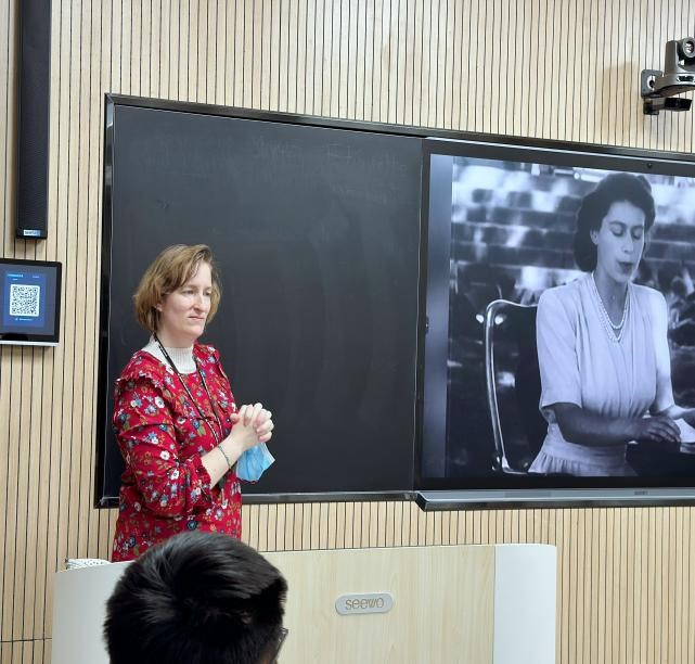 外教Mary在活動(dòng)開(kāi)始介紹不同英語(yǔ)口音的規(guī)則,并重點(diǎn)講解英式口音的特點(diǎn)。通過(guò)對(duì)英女王伊麗莎白和丘吉爾等講話名場(chǎng)面視頻進(jìn)行講解,讓學(xué)生領(lǐng)略了不同口音之美。她生動(dòng)的講述和專業(yè)的指導(dǎo),引導(dǎo)學(xué)生逐步分析典型的英式發(fā)音方法,特別是在元音和輔音的發(fā)音方式上做了細(xì)致的講解。