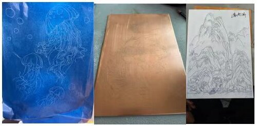 進(jìn)入實(shí)操階段,學(xué)生們?cè)?/span>老師的指導(dǎo)下親身體驗(yàn)制作過程。學(xué)生首先在紫銅板體上繪制紋樣,從幾何圖案到自然元素,風(fēng)格多樣。紫銅板體經(jīng)電爐烘燒淬火后,其延展性顯著增強(qiáng)(硬度降低約30%),使后續(xù)工藝可控性更高。學(xué)生使用專業(yè)工具進(jìn)行鏨刻、沖壓將平面銅板轉(zhuǎn)化為三維造型。隨后進(jìn)入精細(xì)銅絲工序,使用鑷子將扁銅絲彎折成設(shè)計(jì)輪廓,粘貼于紫銅板體上。這一過程要求極高的精度,以確保線條流暢、結(jié)構(gòu)穩(wěn)固,如圖2所示。
