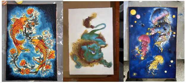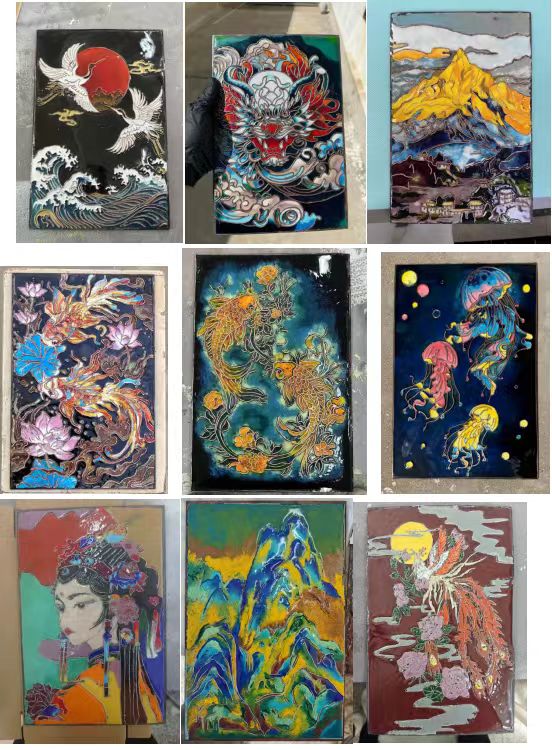 完成造型后,學(xué)生們使用礦物釉料進(jìn)行填充,礦物釉料的填充是課程的關(guān)鍵環(huán)節(jié)。學(xué)生需根據(jù)色彩搭配需求,將釉料分層填入銅絲框內(nèi),填充時(shí)需特別注意礦物釉料稠度控制(水粉比約1:1.5),并通過調(diào)整釉層總厚度(控制在0.8-1.2mm范圍)來(lái)避免高溫開裂。釉料的流動(dòng)性在液態(tài)狀態(tài)下呈現(xiàn)出獨(dú)特的漸變效果,為作品增添了豐富的色彩及層次感,如圖3所示。高溫?zé)?/span>階段,釉料在溫度800℃左右中熔融,與金屬胎體結(jié)合,形成光滑的表面。這一過程中,釉料的化學(xué)組成與溫度曲線共同決定了最終成品的色彩飽和度和光澤度。在咼老師的帶領(lǐng)下我們使用專業(yè)的電窯來(lái)完成燒制,釉色在高溫下熔融呈現(xiàn)瑰麗光澤。燒制完成后,學(xué)生需進(jìn)行精細(xì)的后處理:使用400-600目砂紙打磨銅絲表面,露出金屬光澤;針對(duì)可能存在的釉料缺陷(如氣泡或色斑),采用材料補(bǔ)加工藝(固體含量約30%)進(jìn)行局部修繕;最后進(jìn)行表面清潔和抗氧化處理。