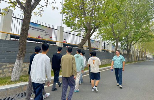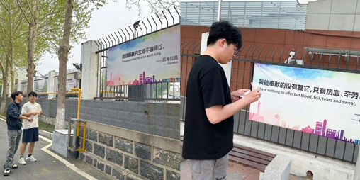 “請(qǐng)大家把手機(jī)留在教室,今天我們不僅要解放雙手,更要打開心靈。”活動(dòng)伊始,David用標(biāo)志性的美式幽默打破拘謹(jǐn)。他帶領(lǐng)學(xué)生來到校園操場(chǎng)圍欄區(qū)——這里有二十余塊勵(lì)志牌,每塊都印刻著世界名人的經(jīng)典格言。外教David首先分享了詩(shī)人雪萊的一句:If winter comes, can spring be far behind?冬天來了,春天還會(huì)遠(yuǎn)嗎?并且分享了自己年輕于逆境中掙扎向上的經(jīng)歷,引導(dǎo)學(xué)生們思考自己最有共鳴的格言及用英文表達(dá)自己的故事。