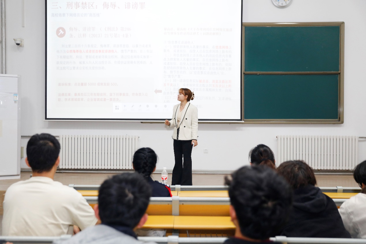 山東睿揚(yáng)律師事務(wù)所劉雯綺律師從專業(yè)法律視角,聚焦“法律成本”核心議題,圍繞“網(wǎng)絡(luò)言論邊界分析、典型違法案例拆解、理性發(fā)聲及合法維權(quán)”展開解讀。她結(jié)合《網(wǎng)絡(luò)安全法》、《禁毒法》等相關(guān)法律法規(guī),通過典型案例分析,清晰闡釋了網(wǎng)絡(luò)暴力、侵權(quán)、參與網(wǎng)絡(luò)詐騙、校園霸凌、涉毒等行為的民事責(zé)任、行政責(zé)任乃至刑事責(zé)任,讓學(xué)生深刻認(rèn)識(shí)到“一時(shí)沖動(dòng)”背后的沉重法律代價(jià)。針對(duì)大學(xué)生常見的兼職維權(quán)、個(gè)人信息保護(hù)等問題,劉律師還提供了實(shí)用的法律維權(quán)指引,鼓勵(lì)學(xué)生學(xué)會(huì)用法律武器保護(hù)自身合法權(quán)益。